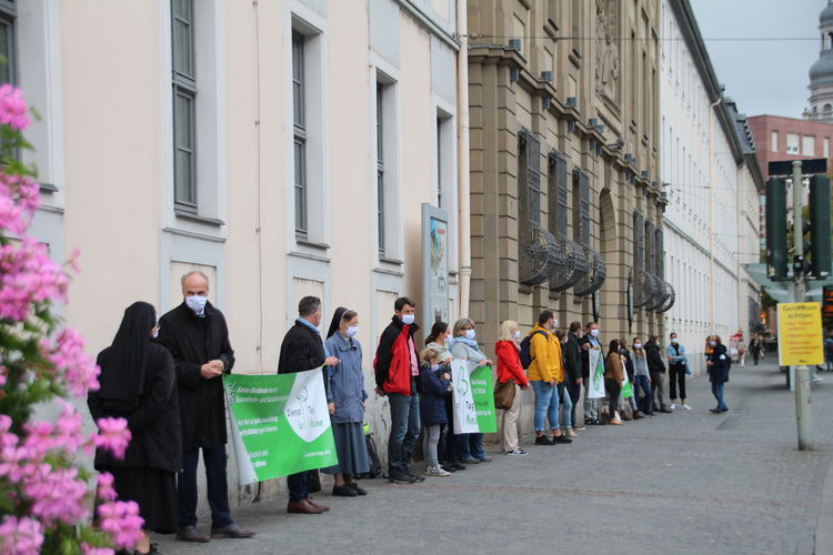 Wie schon in der vergangenen Woche haben wir uns in der Juliuspromenade vor dem Juliusspital für 30 Minuten als Menschenkette aufgestellt. Alle zehn Minuten machten wir mit lautem Klatschen auf uns aufmerksam. Zudem hatten wir dieses Mal noch mehr Banner dabei, um möglichst vielen Passanten die Anliegen unserer Aktion „Dienst-Tag für Menschen“ näherzubringen.