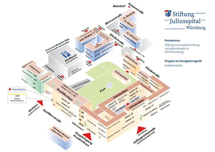 Hinweis: Die Einfahrt über den Röntgenring ist ab 24.06.2025 wegen Straßenbauarbeiten für voraussichtlich 12 Wochen gesperrt, die Zufahrt zum Stiftungsgelände inkl. Klinikum und Parkhaus ist aber weiterhin über die Juliuspromenade möglich, ebenso die Ausfahrt aus der Koellikerstraße auf den Röntgenring.
